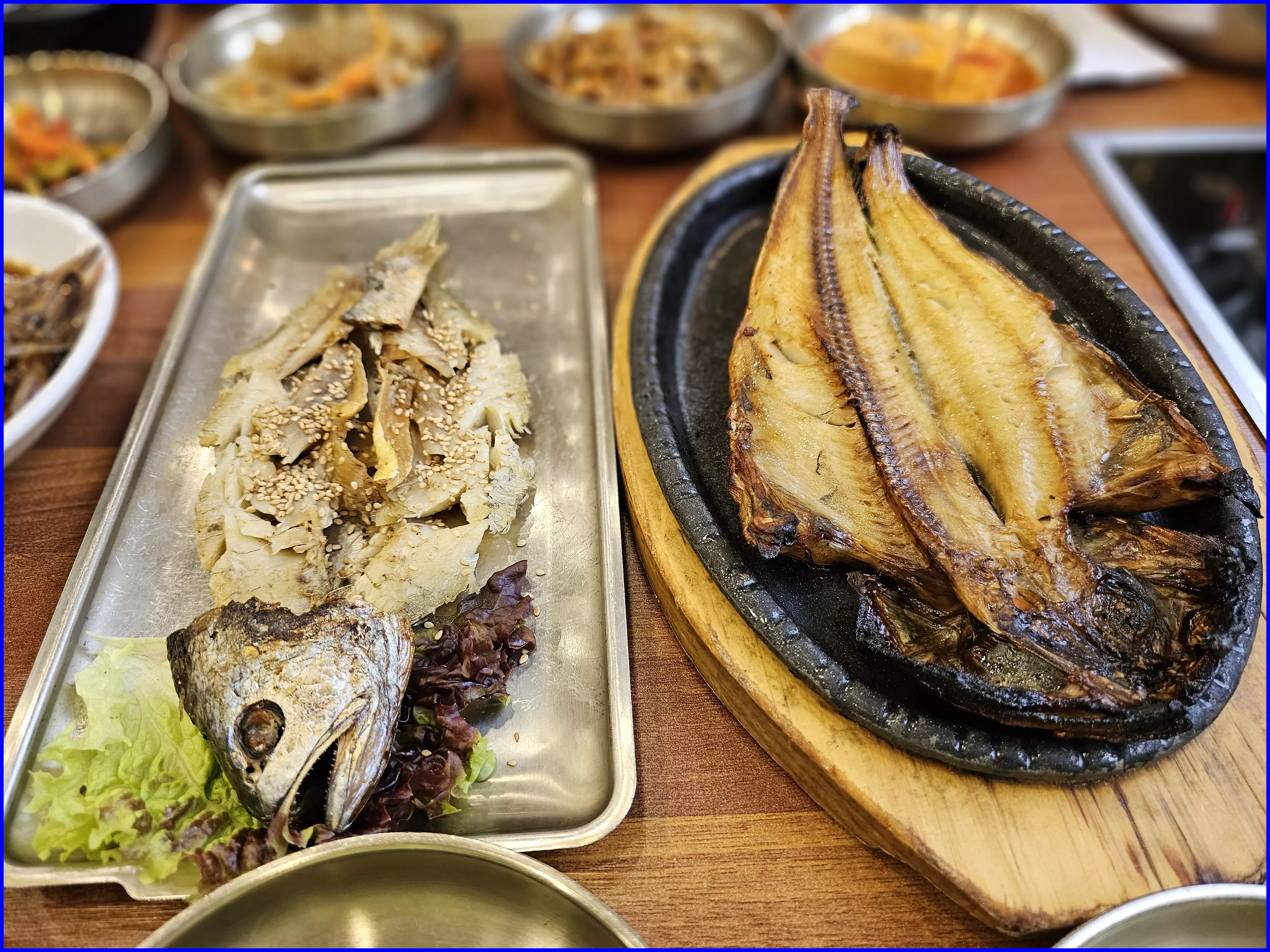 메인 메뉴였던 간장게장과 보리 굴리, 임연수 구이를 시작으로 보기도 좋고 건강에도 좋아 보이는 다양한 나물과 잡채, 김치 등이 한가득 차려졌습니다.
